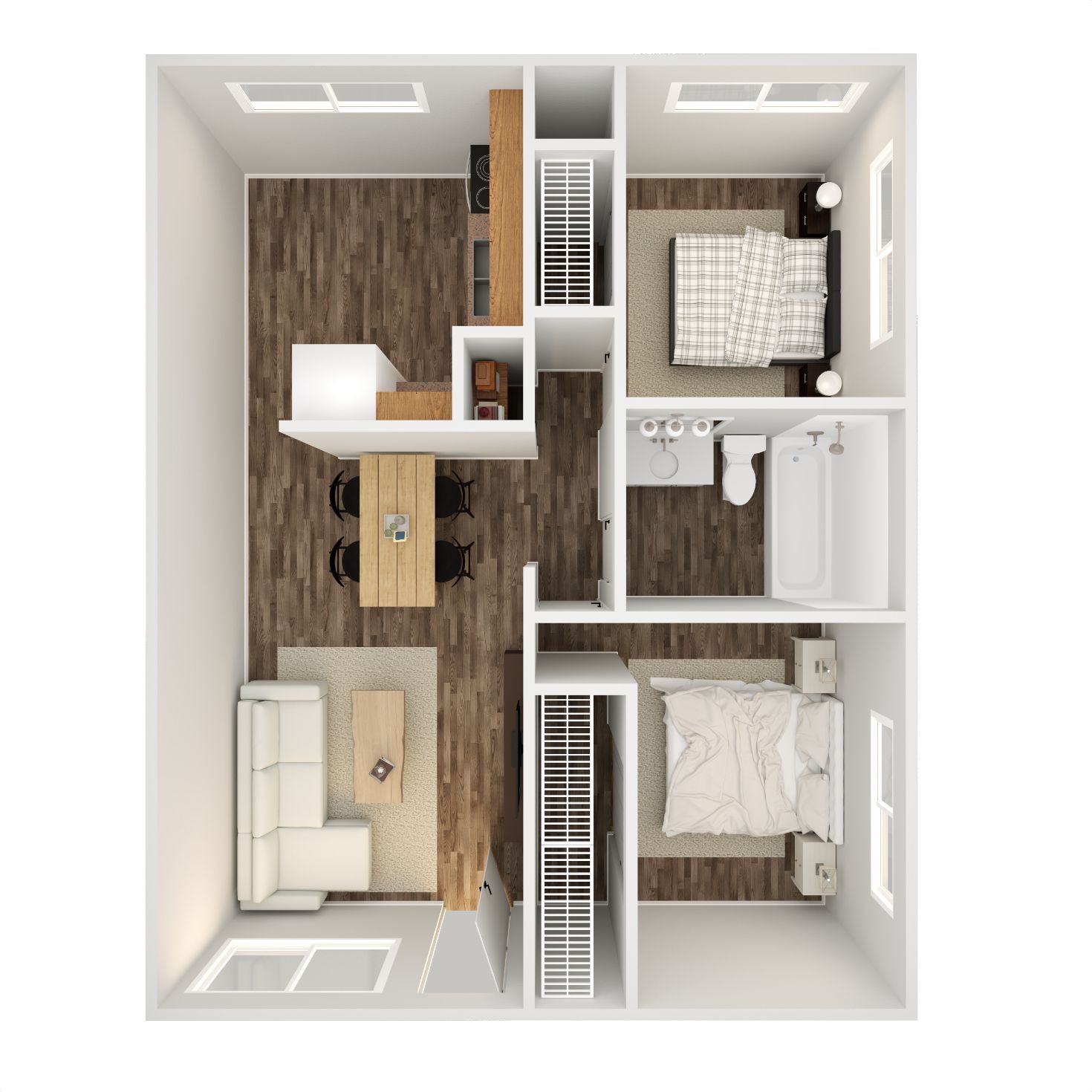 Our 750 sq. ft. 2 bed/1 bath units, available on upper and lower floors, are designed for your comfort. Residents enjoy a serene setting with pine trees, an onsite laundry facility, and a flexible pet policy accommodating small animals, one cat, or dogs on a case-by-case basis.
